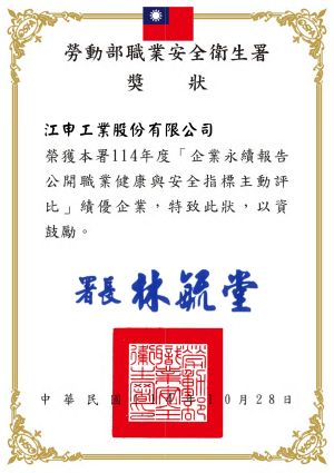 062025 11KianShen Industrial Co., Ltd. was recognized by the Occupational Safety and Health Administration in its "Proactive Evaluation of Occupational Health and Safety Performance in Enterprise Sustainability Reports". - VIEW MORE